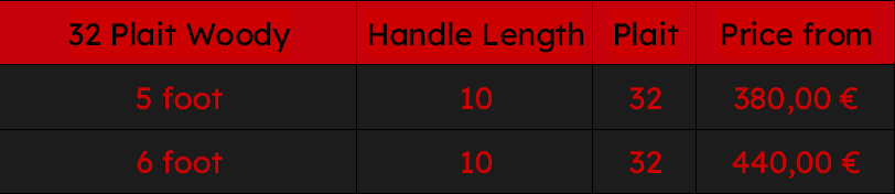 Die Preisliste beinhaltet nur den Peitschenkörper, der Preis des Griffes kommt noch dazu! Da es einfach zu viele Holzvarianten und Dekorationsmöglichkeiten gibt, ist es unmöglich, für jeden Holzgriff alle Preise)